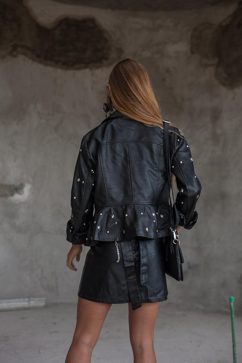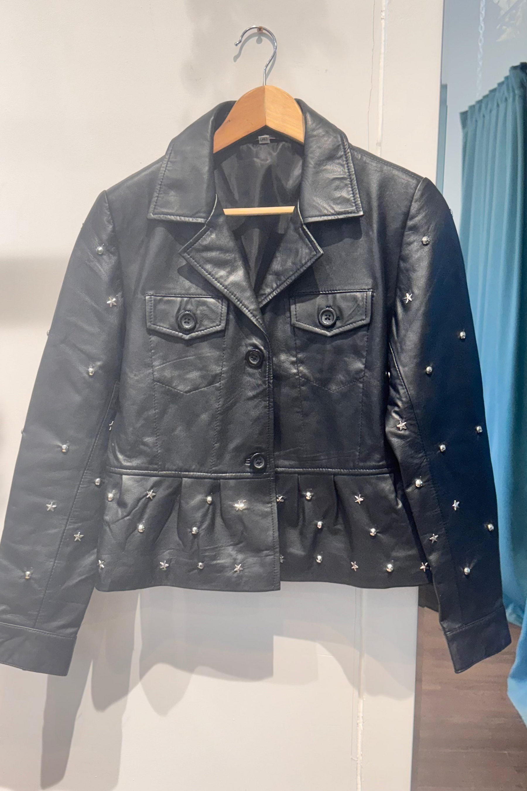 Chaqueta de cuero con tachas de estrella. Es perfecta para llevar sobre looks para salidas de día o de noche.
