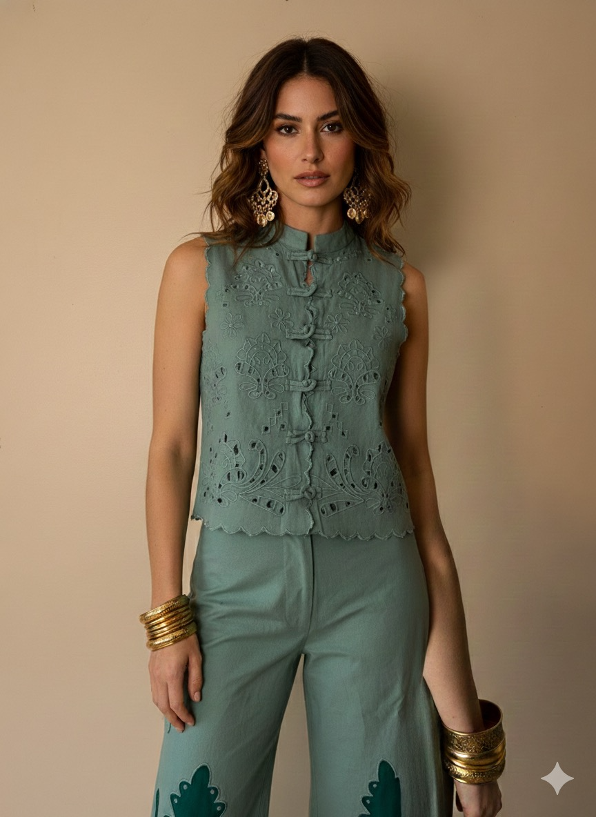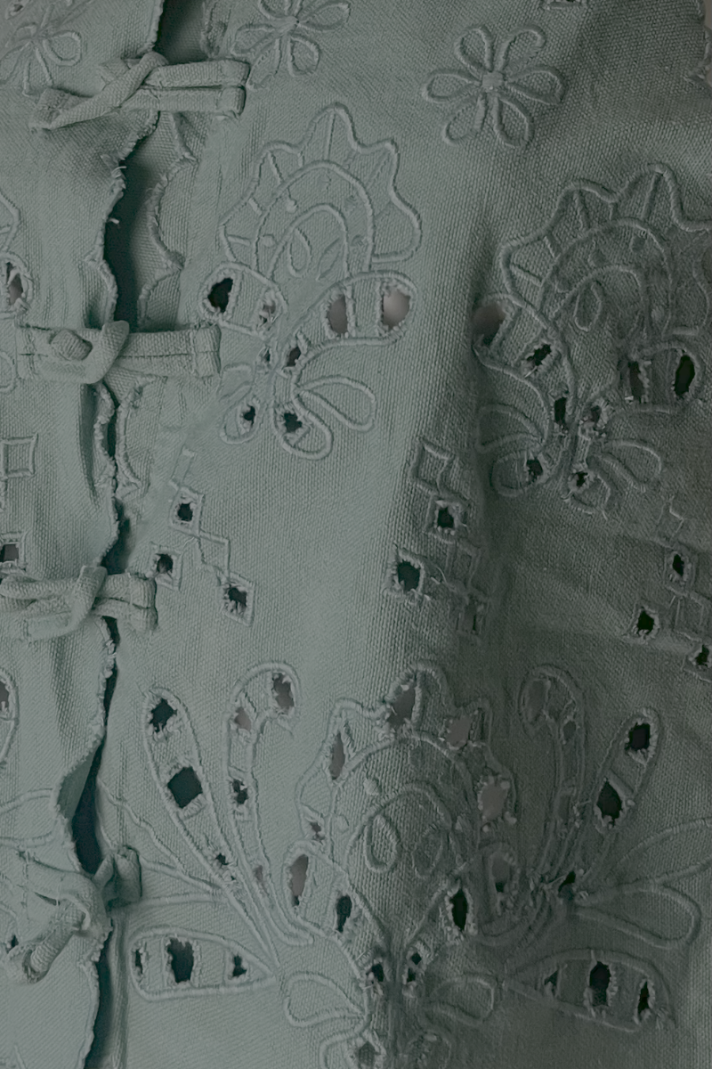 Blusa de algodón bordado. Se puede usar cerrado solo o abierto como vest.