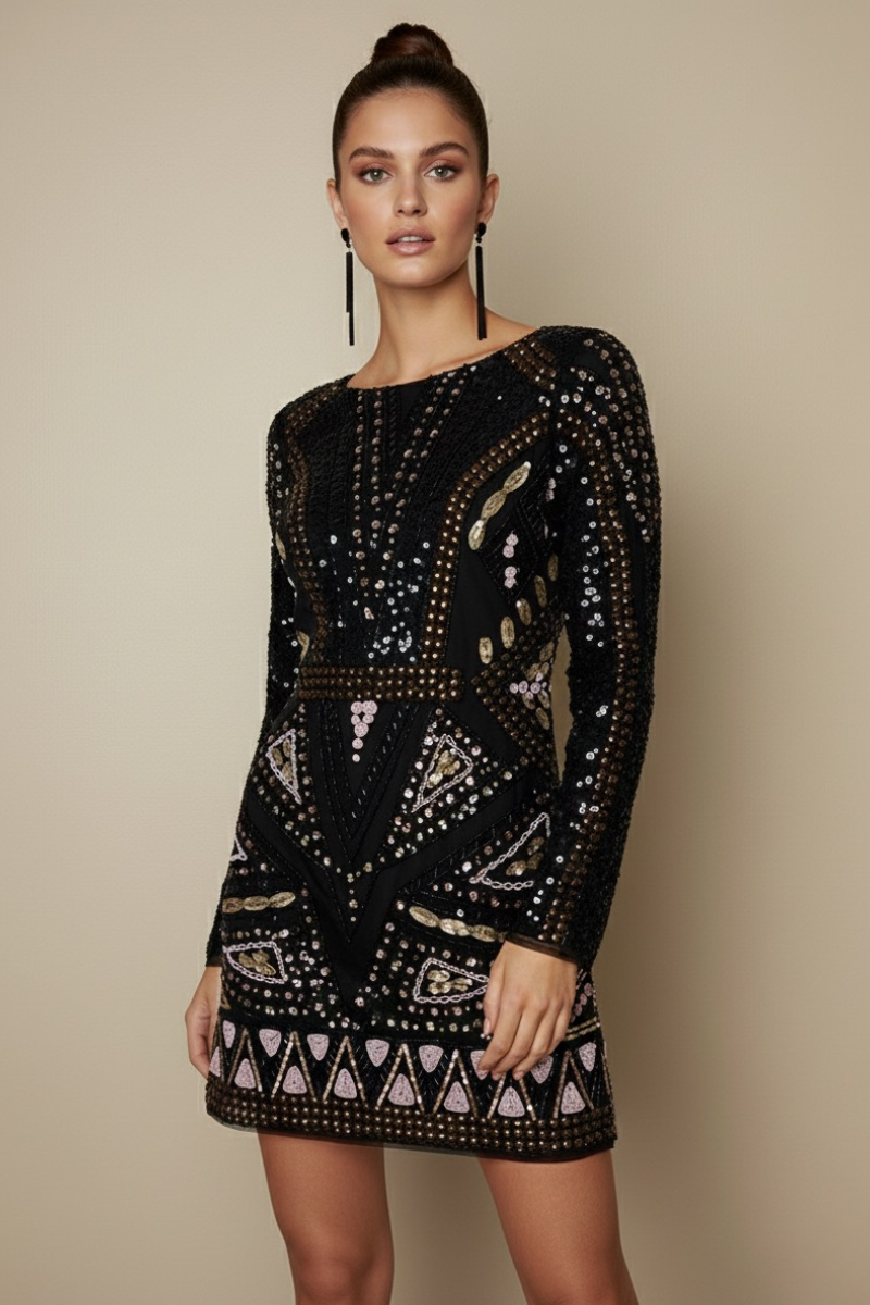 Vestido mini , manga larga , con bellísimo trabajo de bordado con pedrería y lentejuelas.