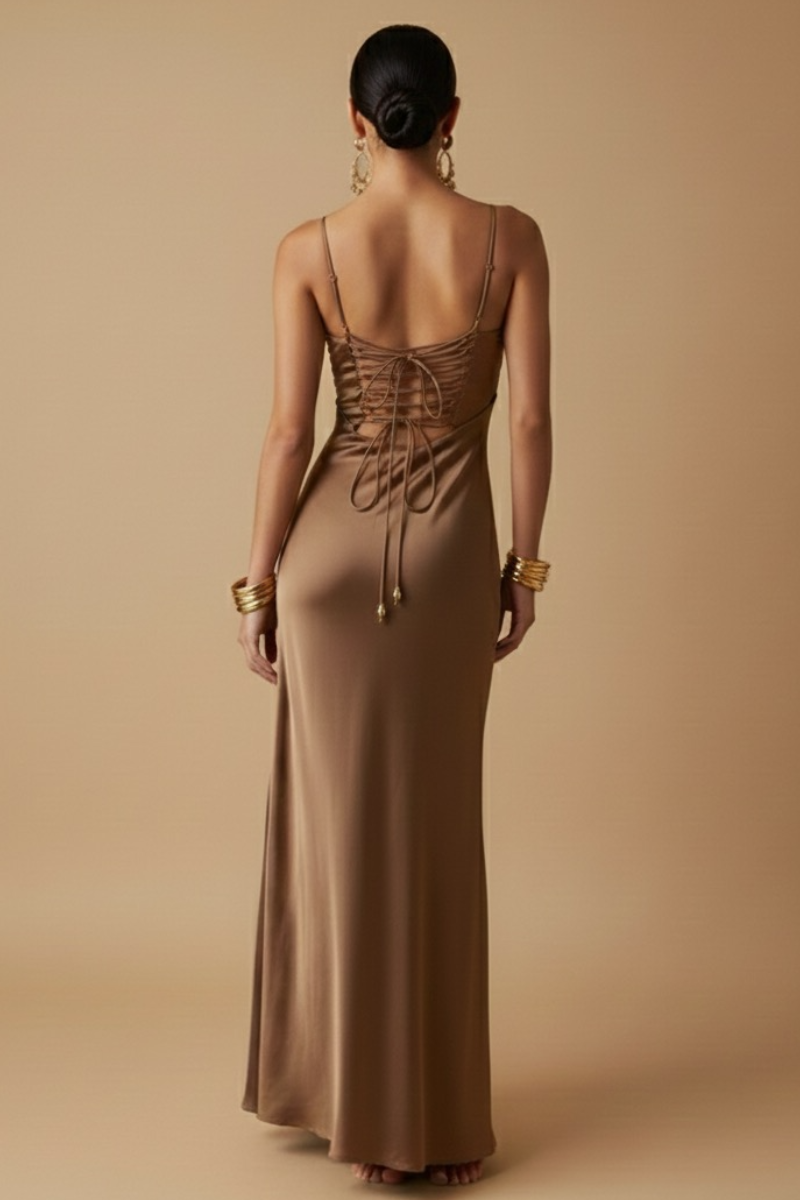 Confeccionado en satín a base de viscosa, su textura suave refleja sutilmente la luz, mientras el tono bronze brown aporta una presencia envolvente y sofisticada.